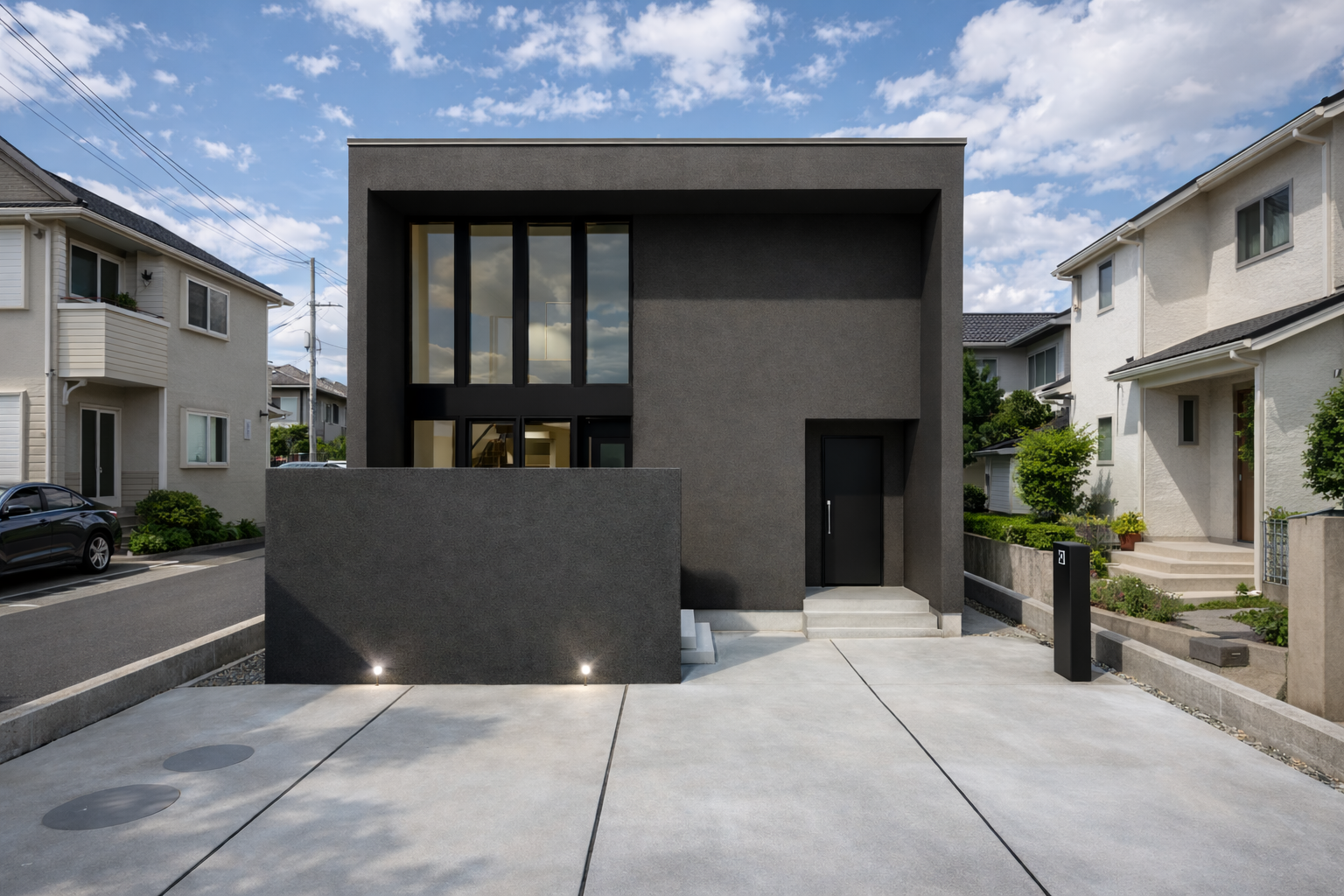 マットな質感のグレーのキューブ型に、縦に伸びる窓が印象的。 飾りすぎず、削ぎすぎず。 「なんかいいな」と感じる外観には、光の入り方まで計算された設計の意図があります。