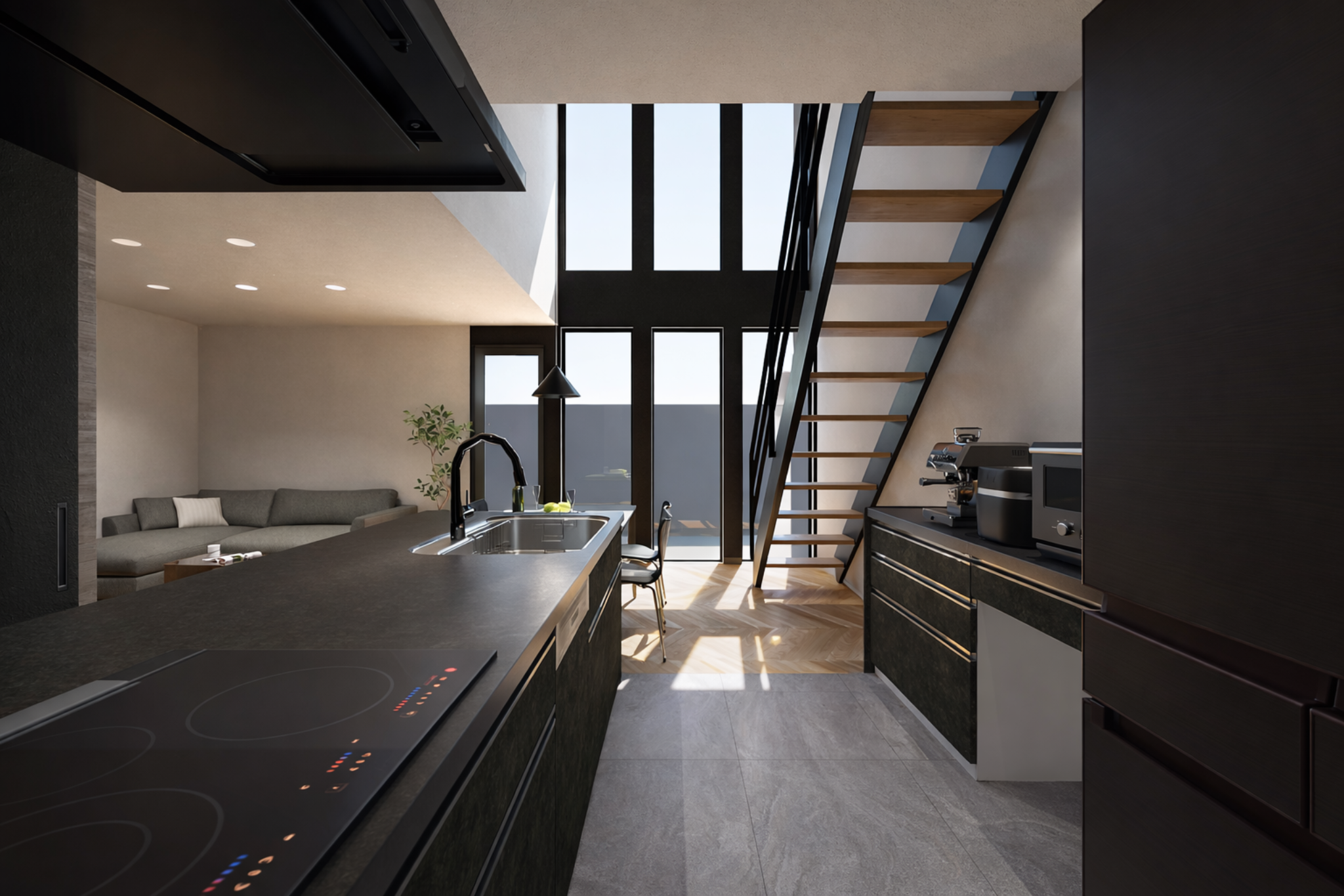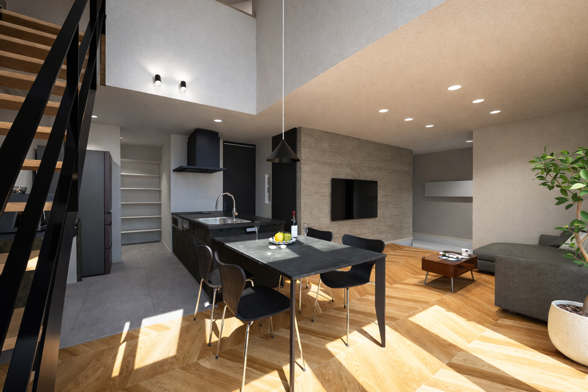 吹き抜け+大開口のLDKで、光と開放感に包まれる