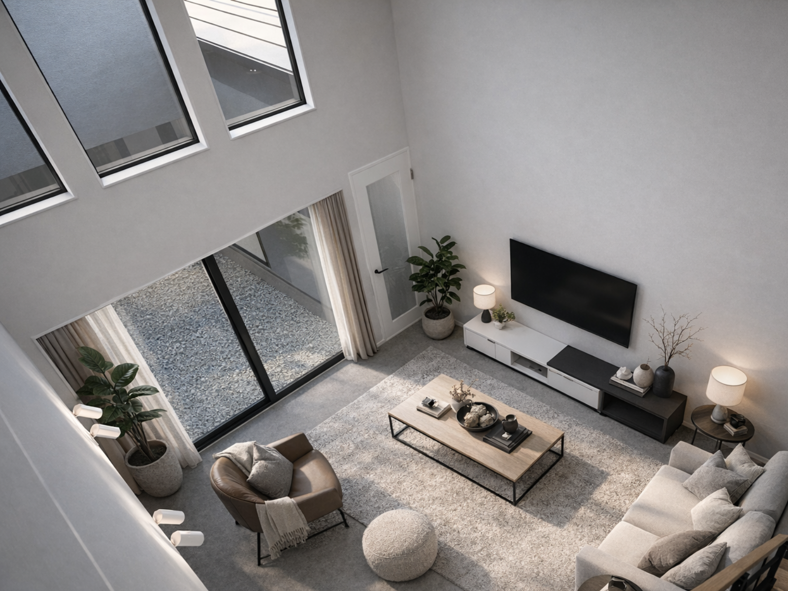リビングの吹き抜けと中庭から差し込むやわらかな自然光。