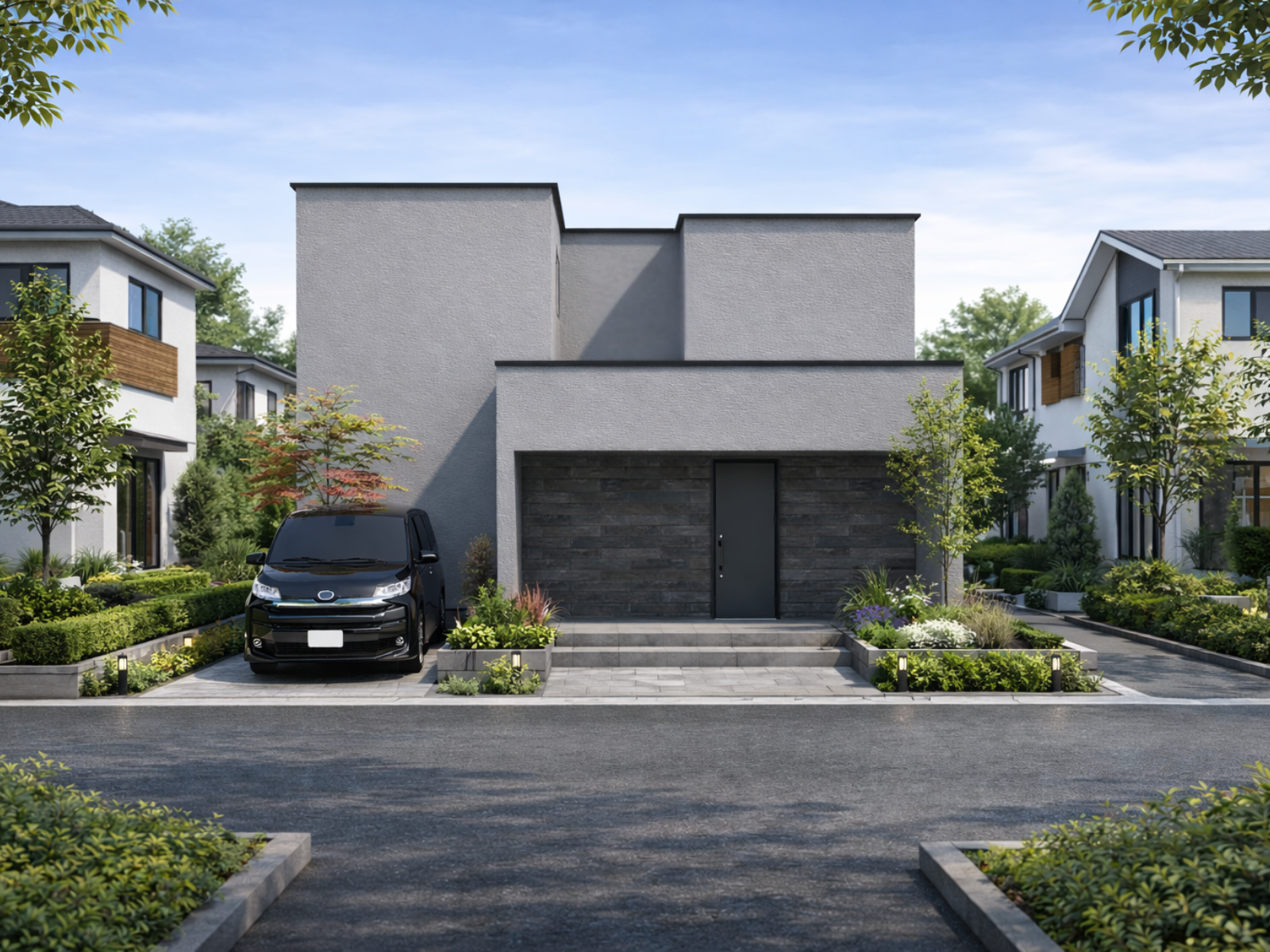道路側には、あえて窓をほとんど見せない潔いファサード。外からの視線を遮り、内側の心地よさを最大化する設計です。