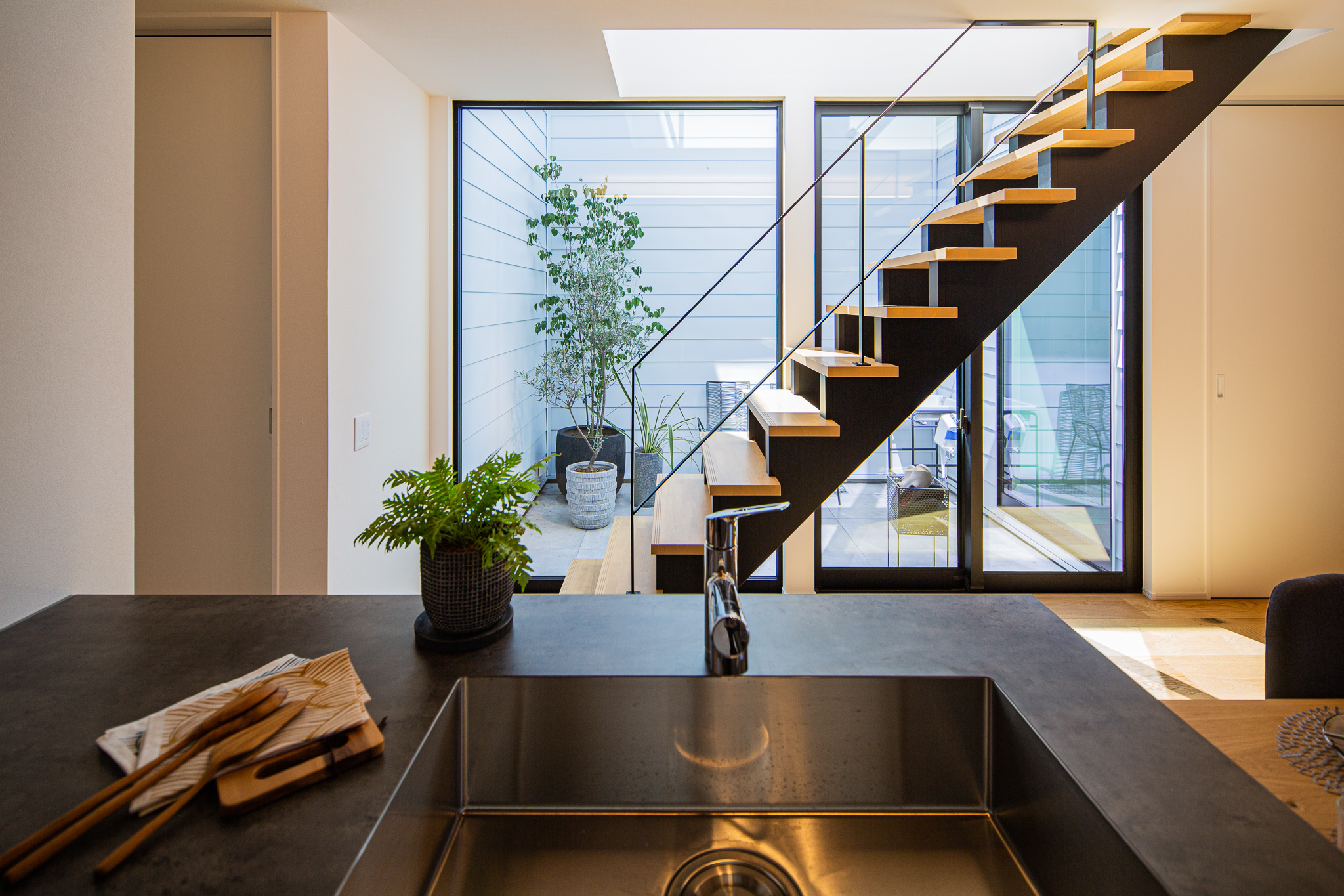 中庭やガレージともシームレスにつながり、敷地条件によってはコスト面でも現実的な選択肢に。