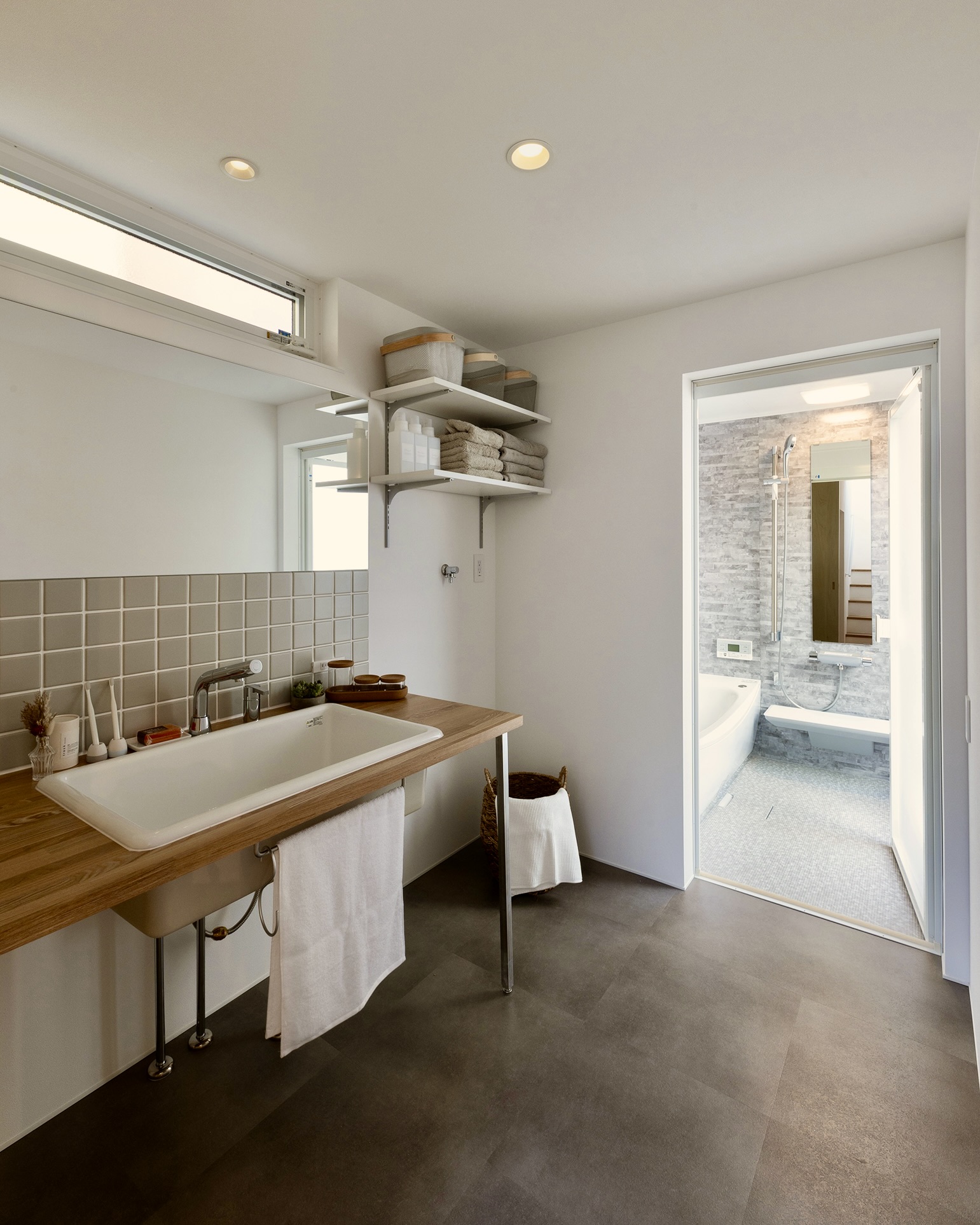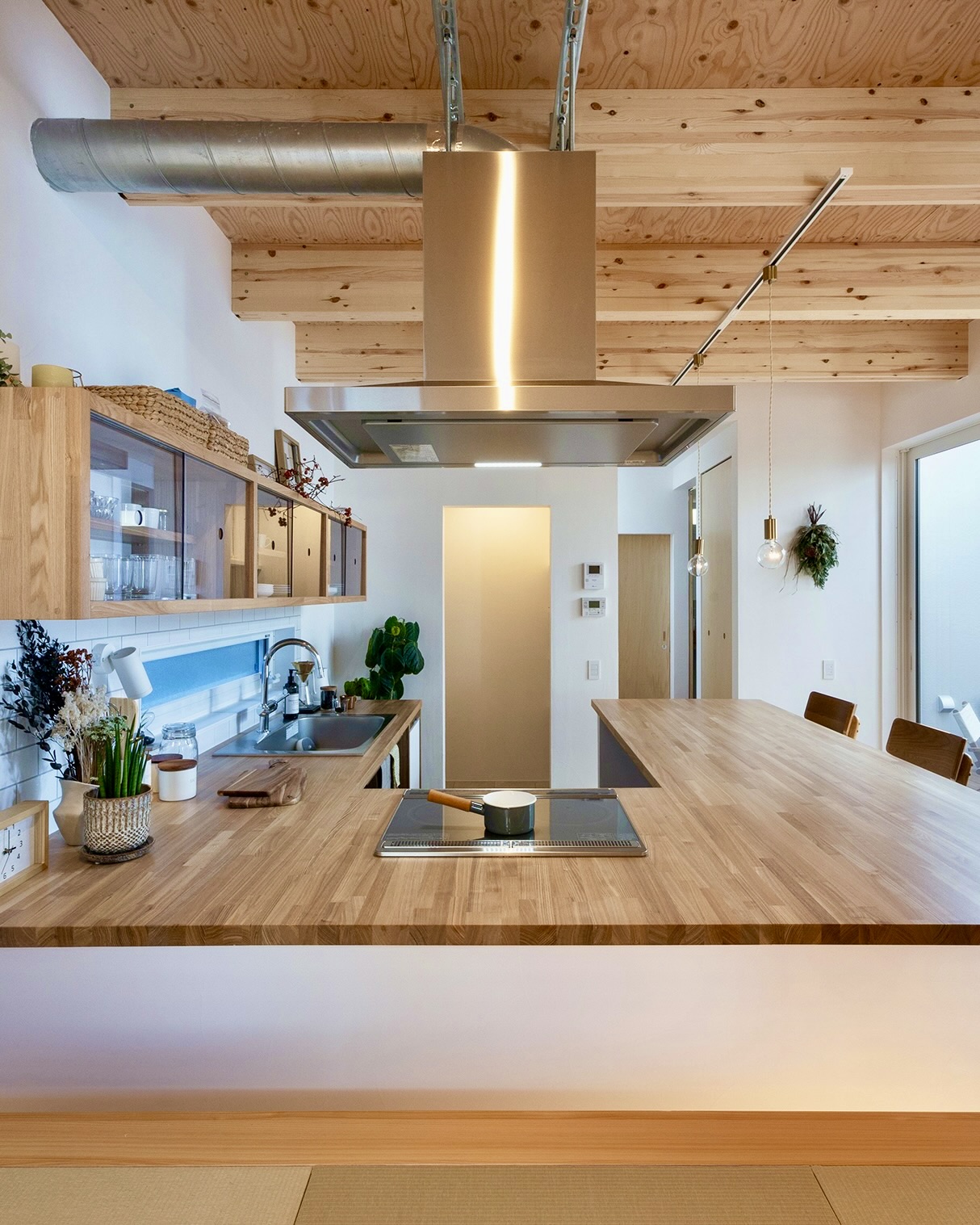 大きなカウンターを囲むと、あたたかい湯気と会話がふわっと広がる冬のキッチン。リビング、ダイニング、和室へ自然につながる動線で、家のどこにいても家族の気配がやさしく届きます。カフェのような佇まいに、あたたかい料理を囲む冬のだんらん時間がよく似合う空間です。