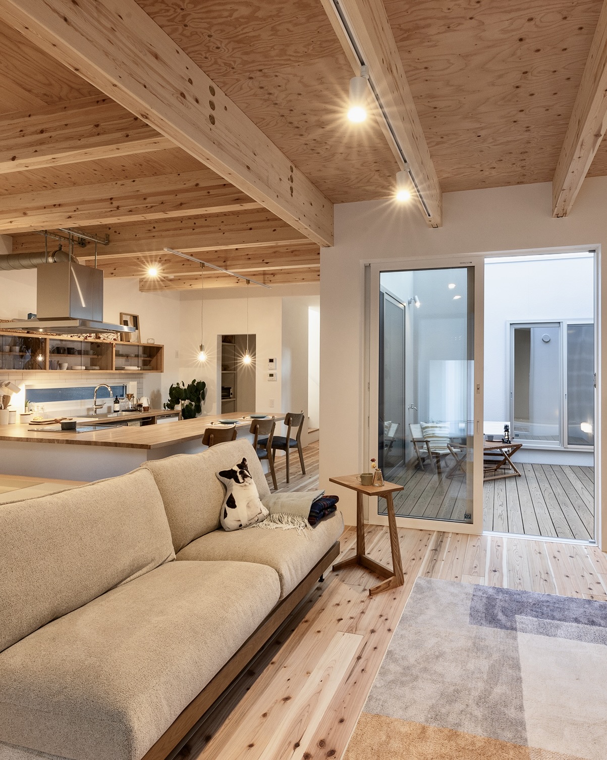 木の質感が心地よいLDKに、冬の日差しがふんわり差し込むあたたかい空間。キッチン・リビング・中庭がゆるやかにつながり、家族の会話や気配が自然と続く冬のだんらんが生まれます。