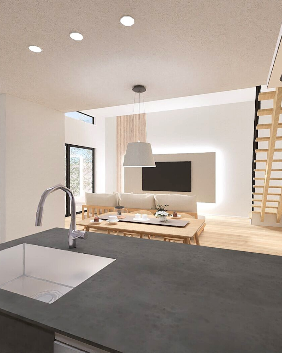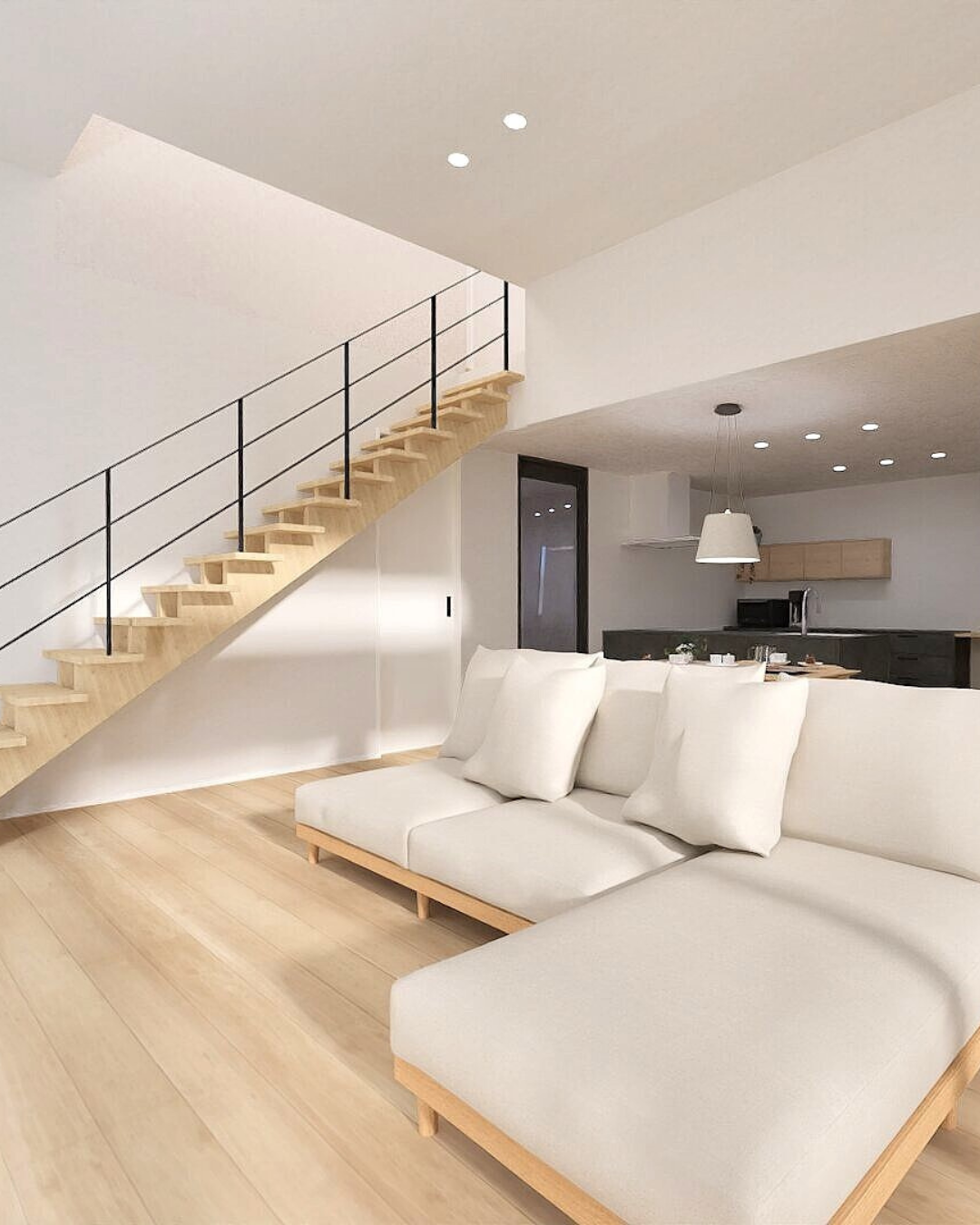 とにかく広くて開放的なリビングをご希望だったご夫婦、大きな高天井とストリップ階段が空間に抜けをつくり、家族の気配を感じながら過ごせるリビングに仕上げました。