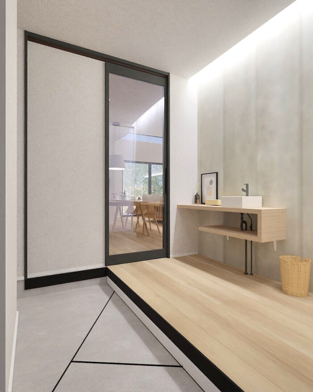 玄関→LDK→洗面→脱衣室と直線でつながる動線で、帰宅後の手洗いや洗濯動線がスムーズに。中庭で遊んでどろんこになったら、脱衣室へ直接入ることもできます。