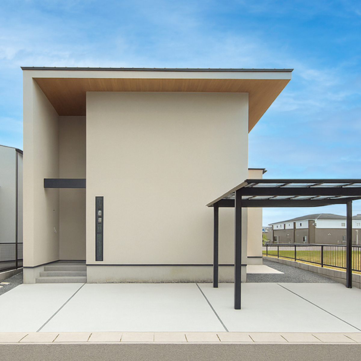 光の当たり方によってグレーにもベージュにも見える、やわらかく深みのあるニュアンスカラー。ブラックのガルバリウムと木目調の軒天が美しく調和し、上質なナチュラルスタイルを引き立てています。