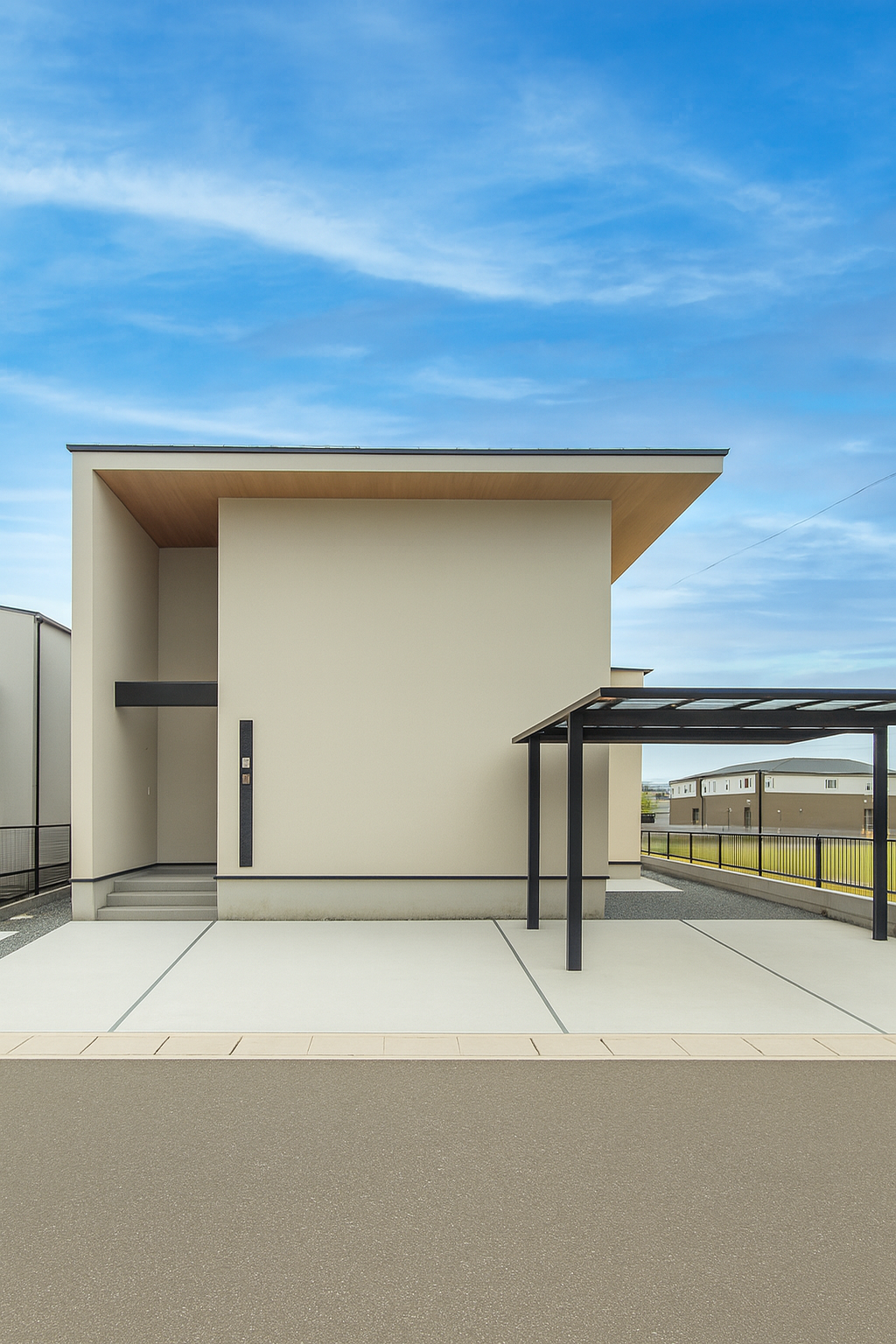 光の当たり方によってグレーにもベージュにも見える、やわらかく深みのあるニュアンスカラー。ブラックのガルバリウムと木目調の軒天が美しく調和し、上質なナチュラルスタイルを引き立てています。