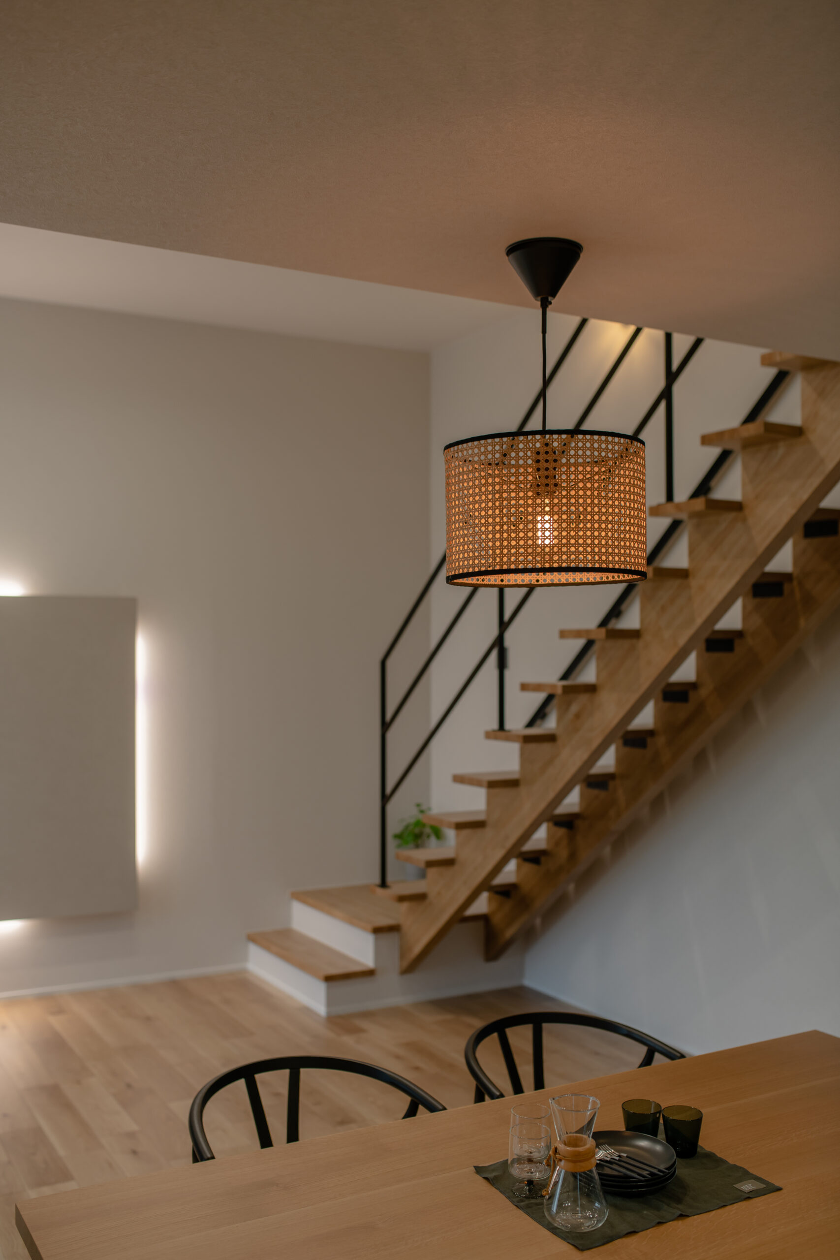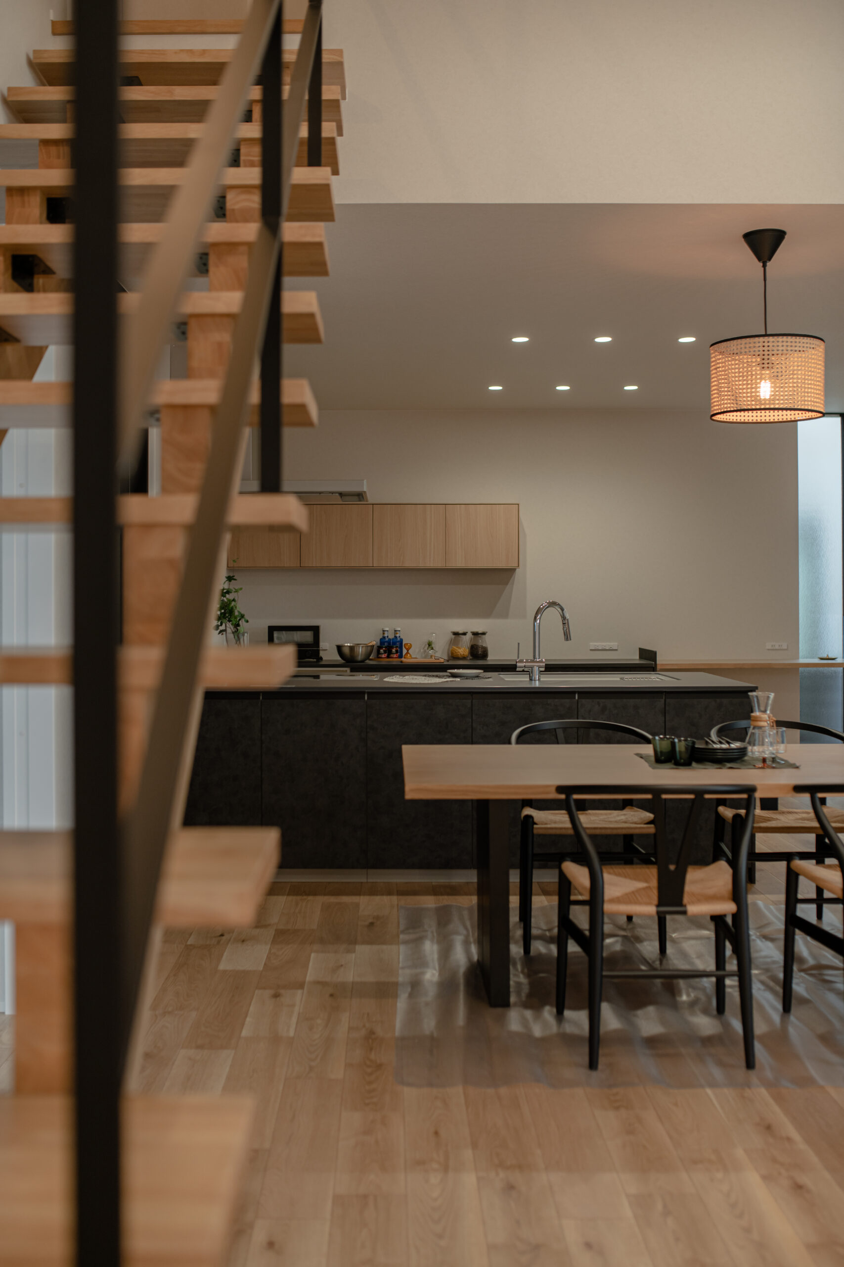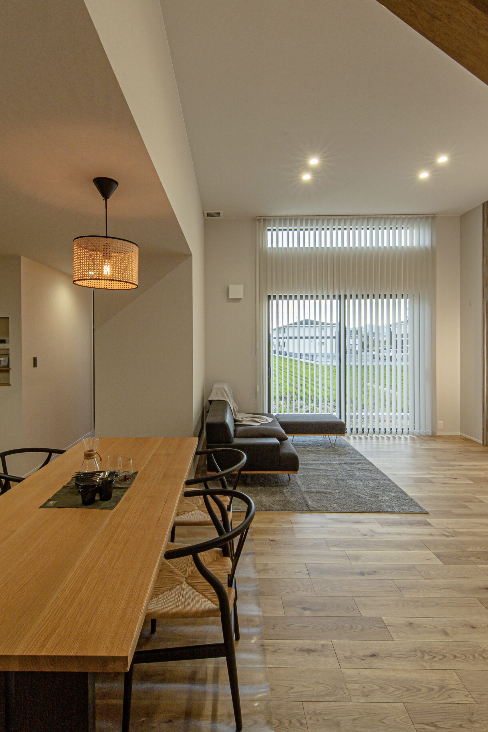 とにかく広くて開放的なリビングをご希望だったご夫婦、大きな高天井とストリップ階段が空間に抜けをつくり、家族の気配を感じながら過ごせるリビングに仕上げました。
