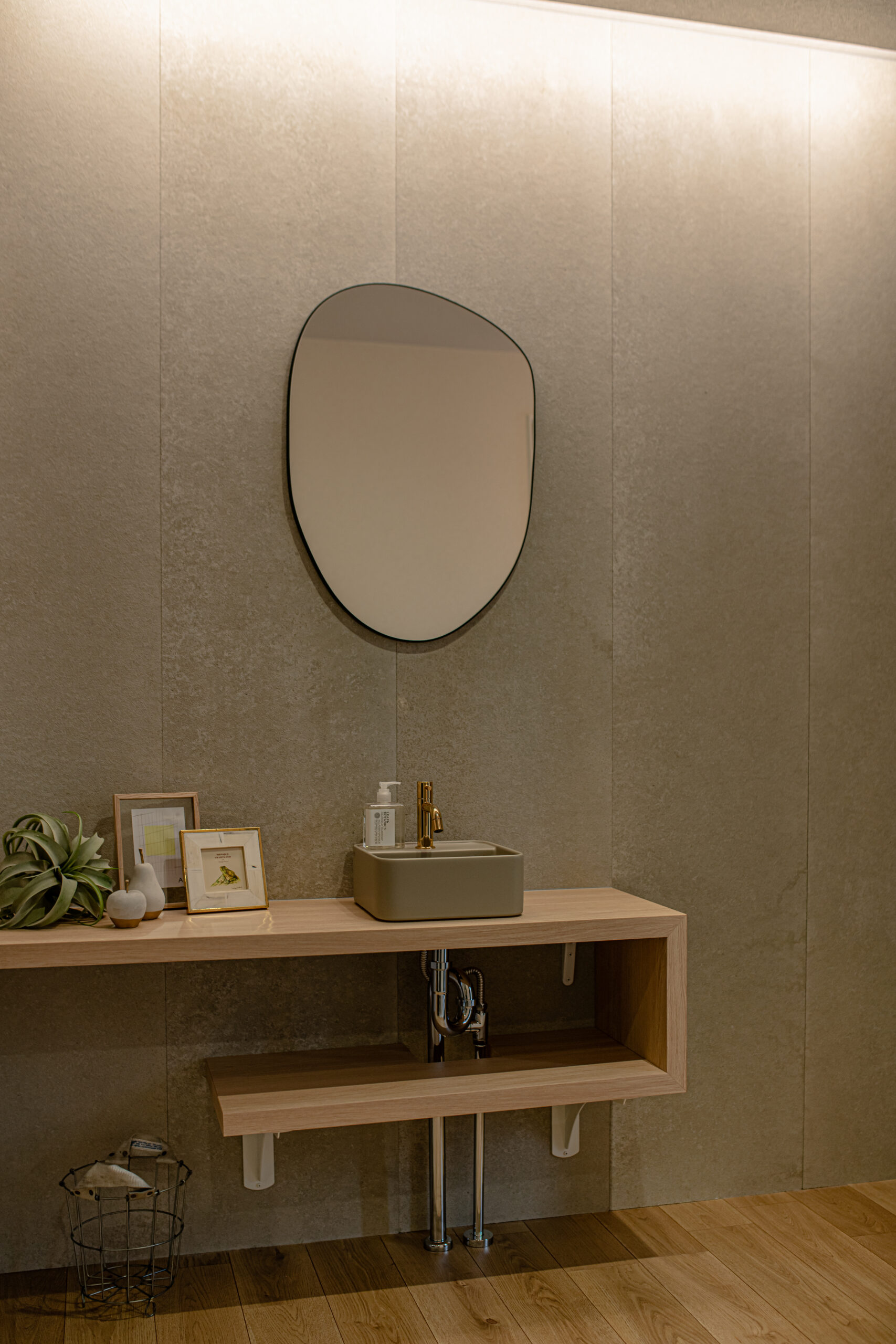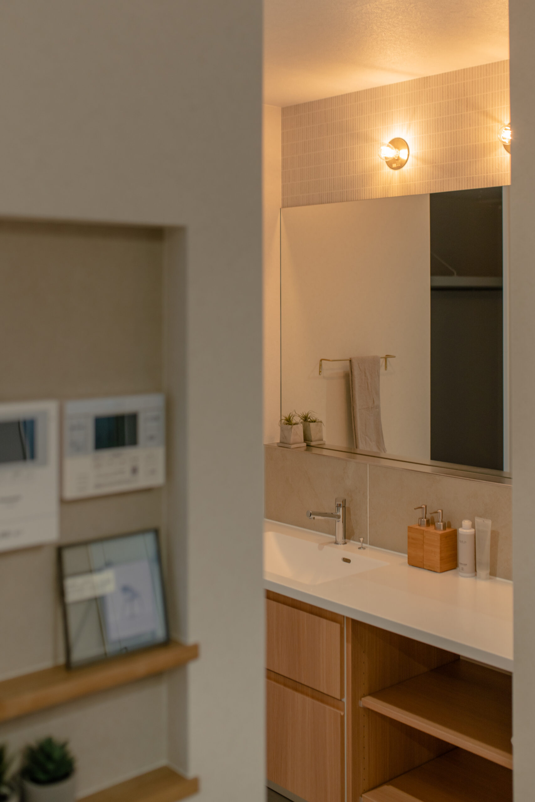 玄関→LDK→洗面→脱衣室と直線でつながる動線で、帰宅後の手洗いや洗濯動線がスムーズに。中庭で遊んでどろんこになったら、脱衣室へ直接入ることもできます。