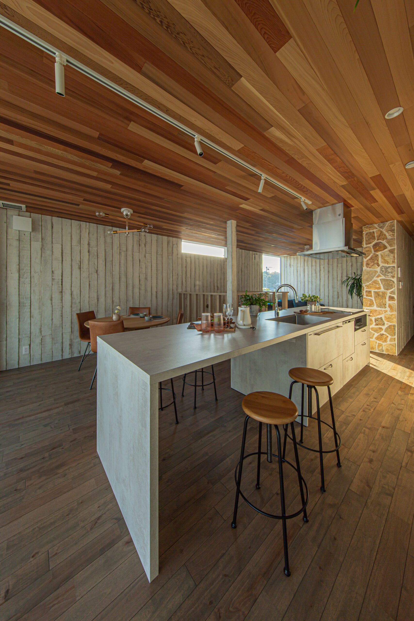 水平ラインと石の質感が、海辺の景色に溶け込むようにデザインされた住まい。自然の光と風を受けとめながら、上質なリゾートのような佇まいです。