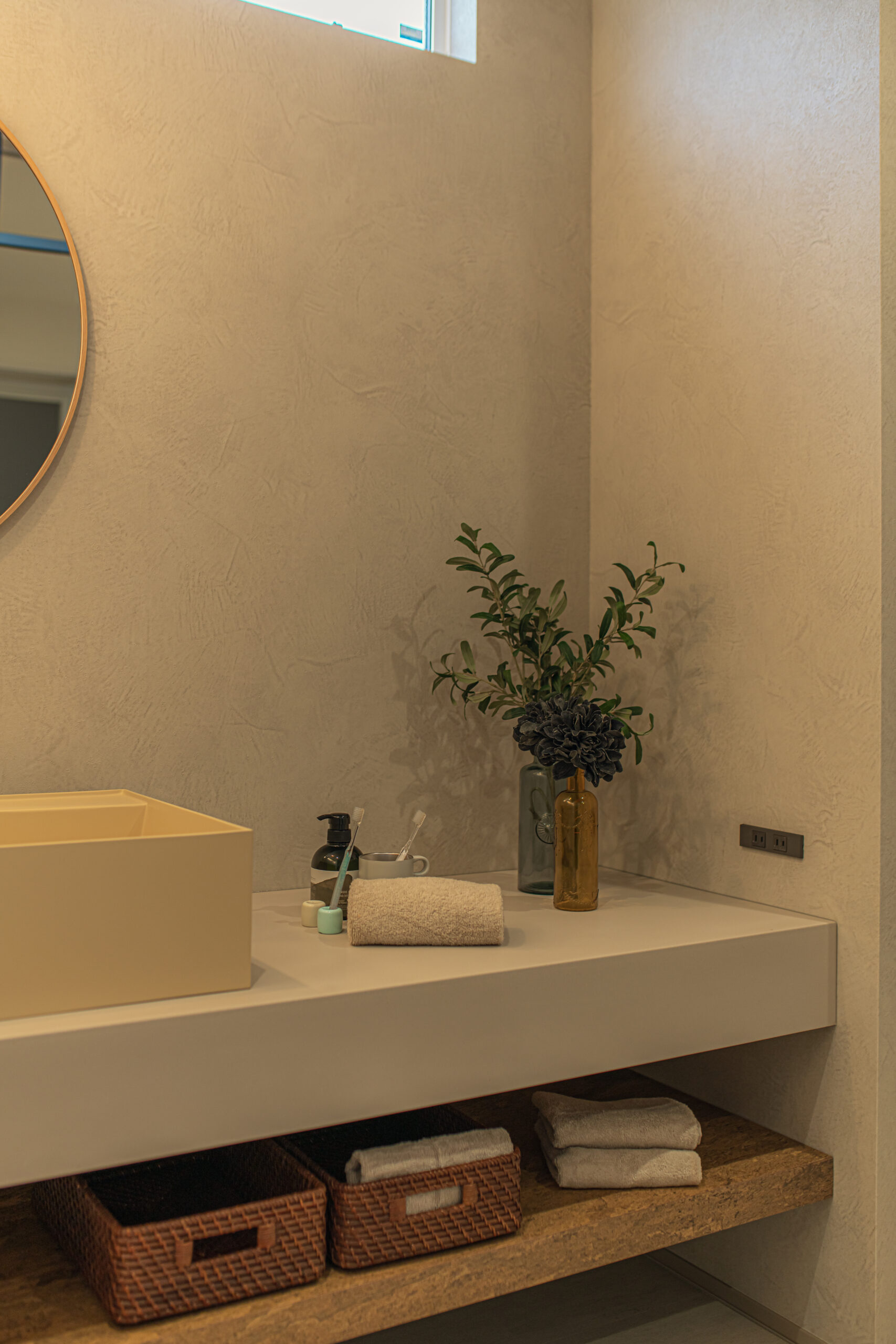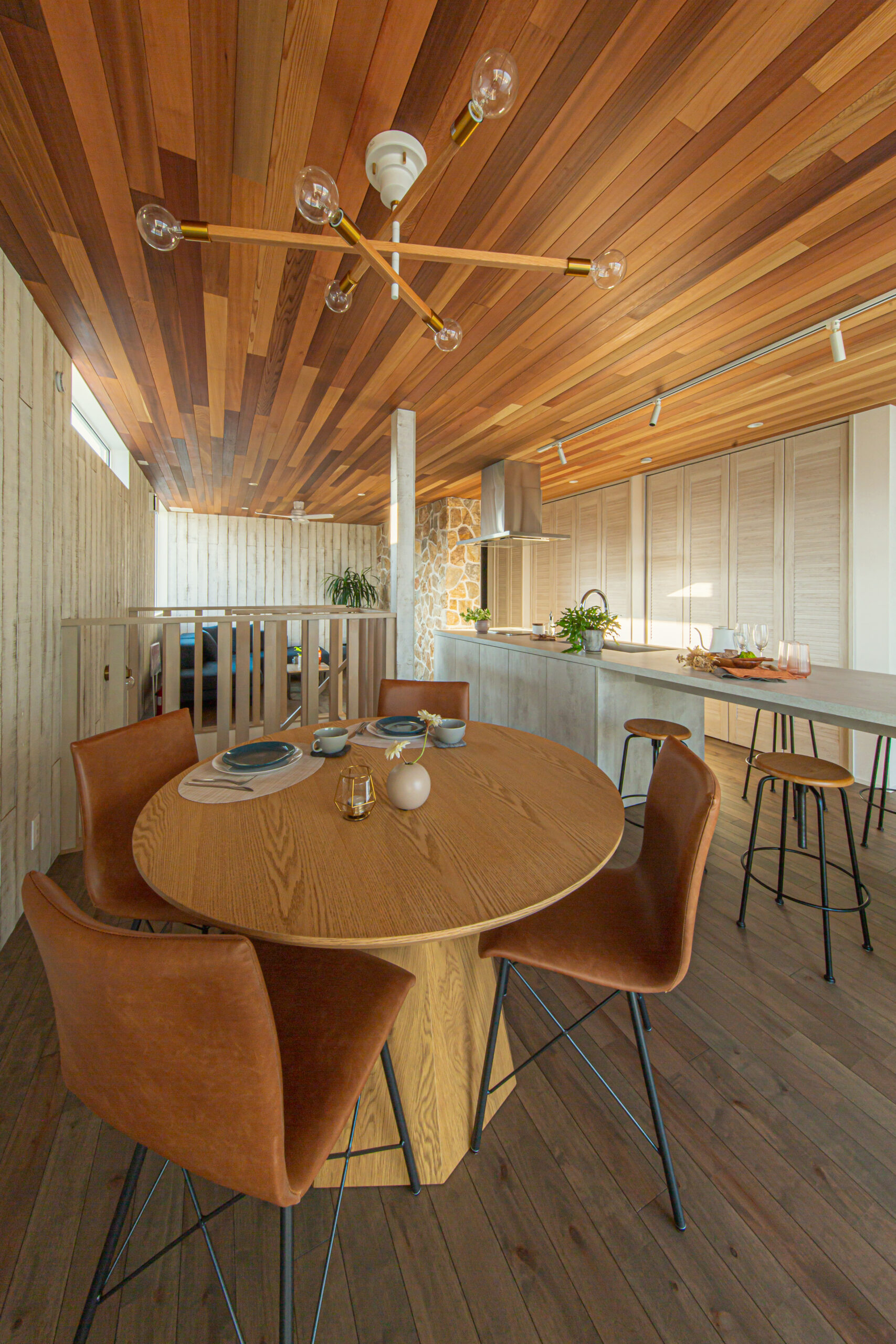 天井を彩るレッドシダーの木目、手ざわりのある石壁、そして落ち着いた色調の床材。素材のひとつひとつが調和し、五感でくつろげる空間に。時間とともに深まる質感が、暮らしを豊かにしてくれます。